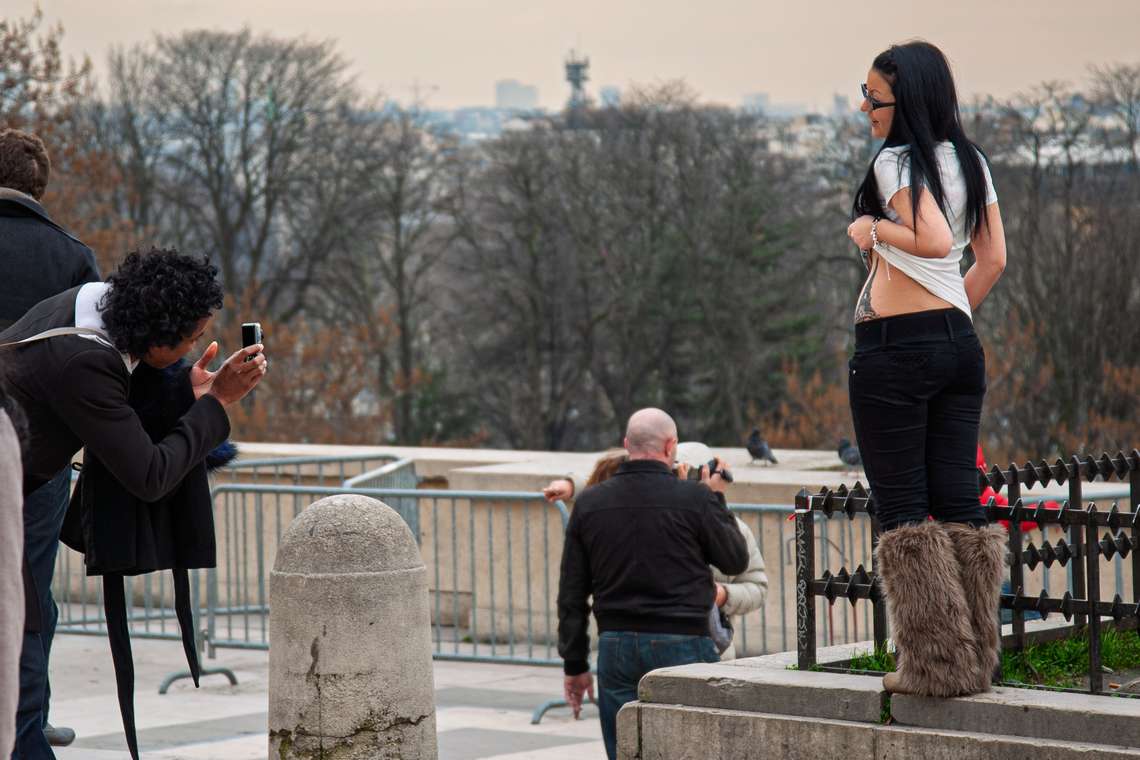 I love watching other people take pictures of iconic landmarks like the Eiffel Tower. Some can get pretty creative. This gal even went so far as to get the Tower tattooed on her hip and then showed it off so I guess she could compare her tattoo to the real thing in the background.