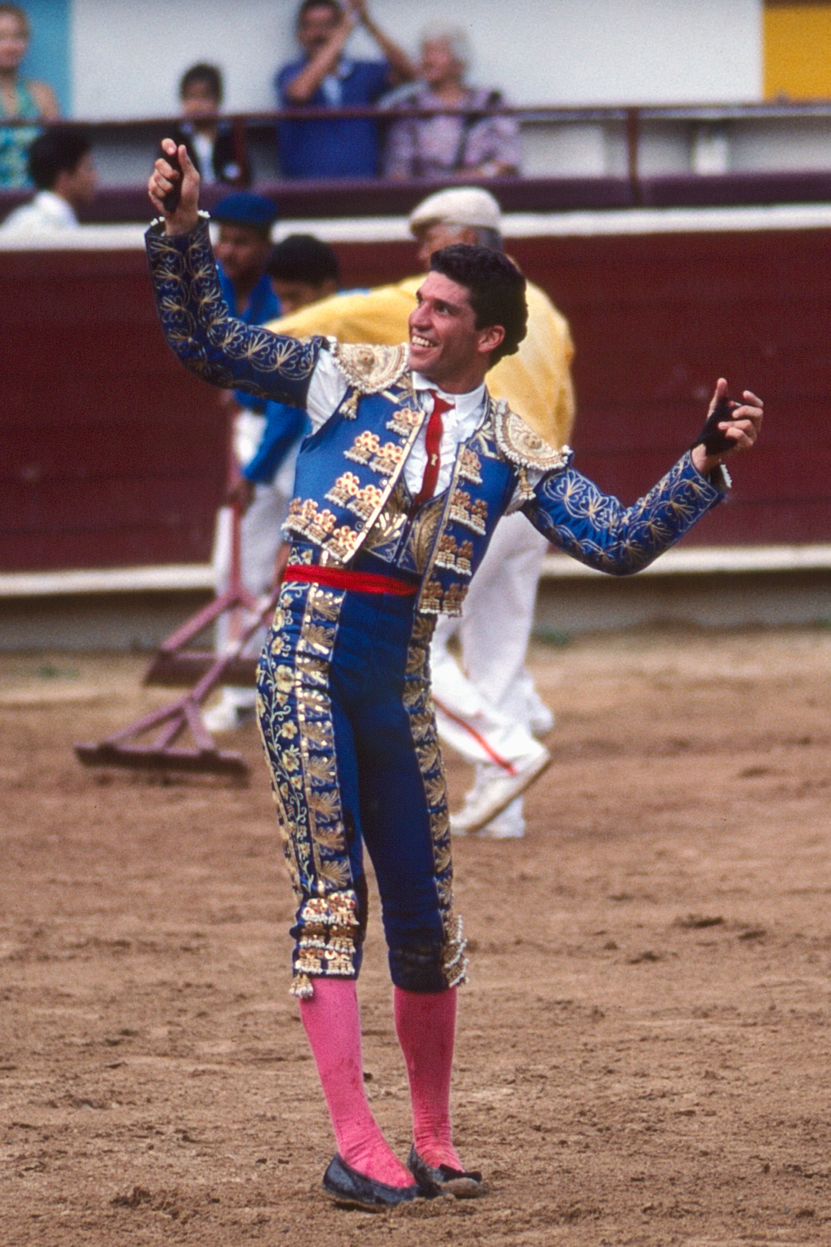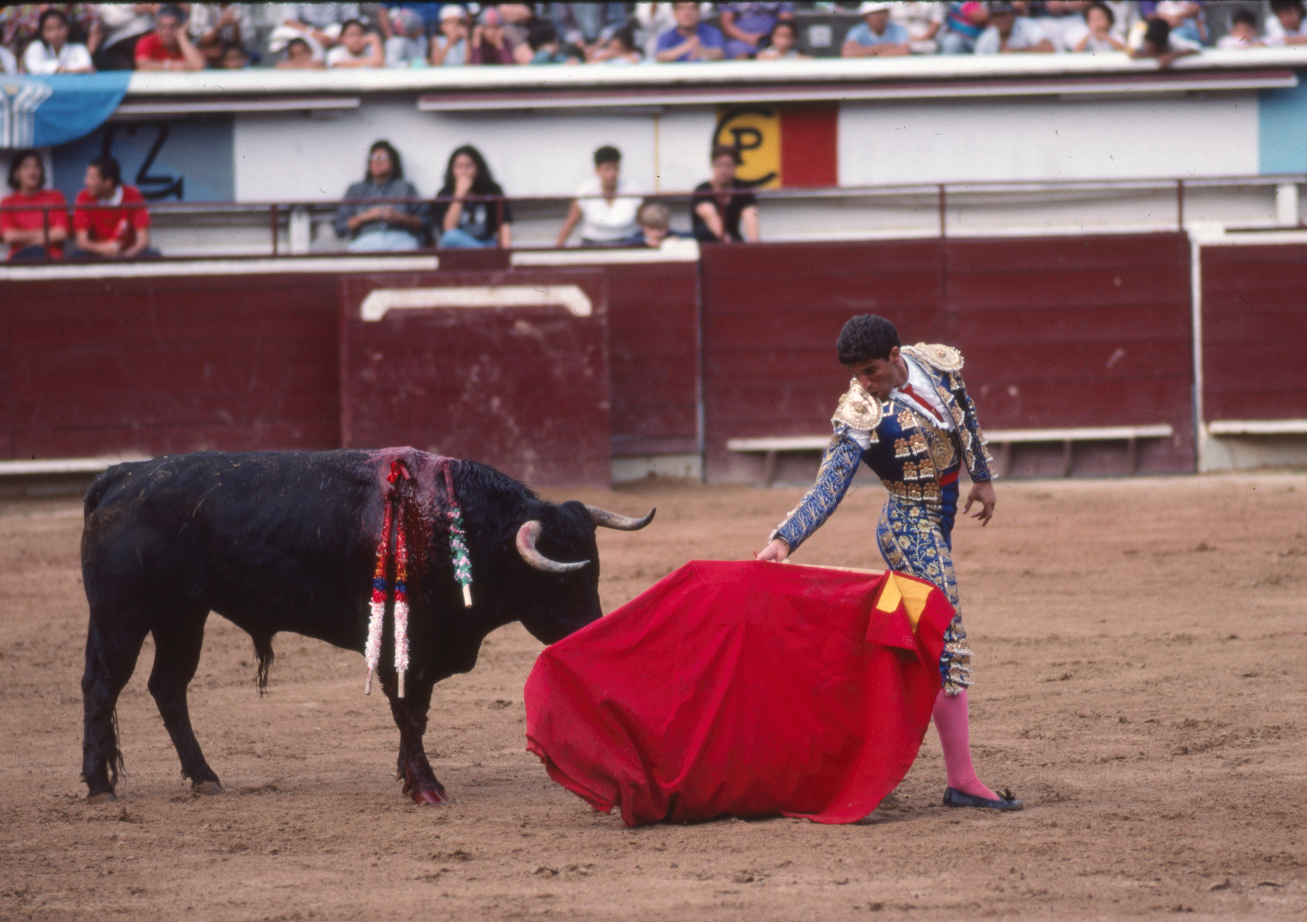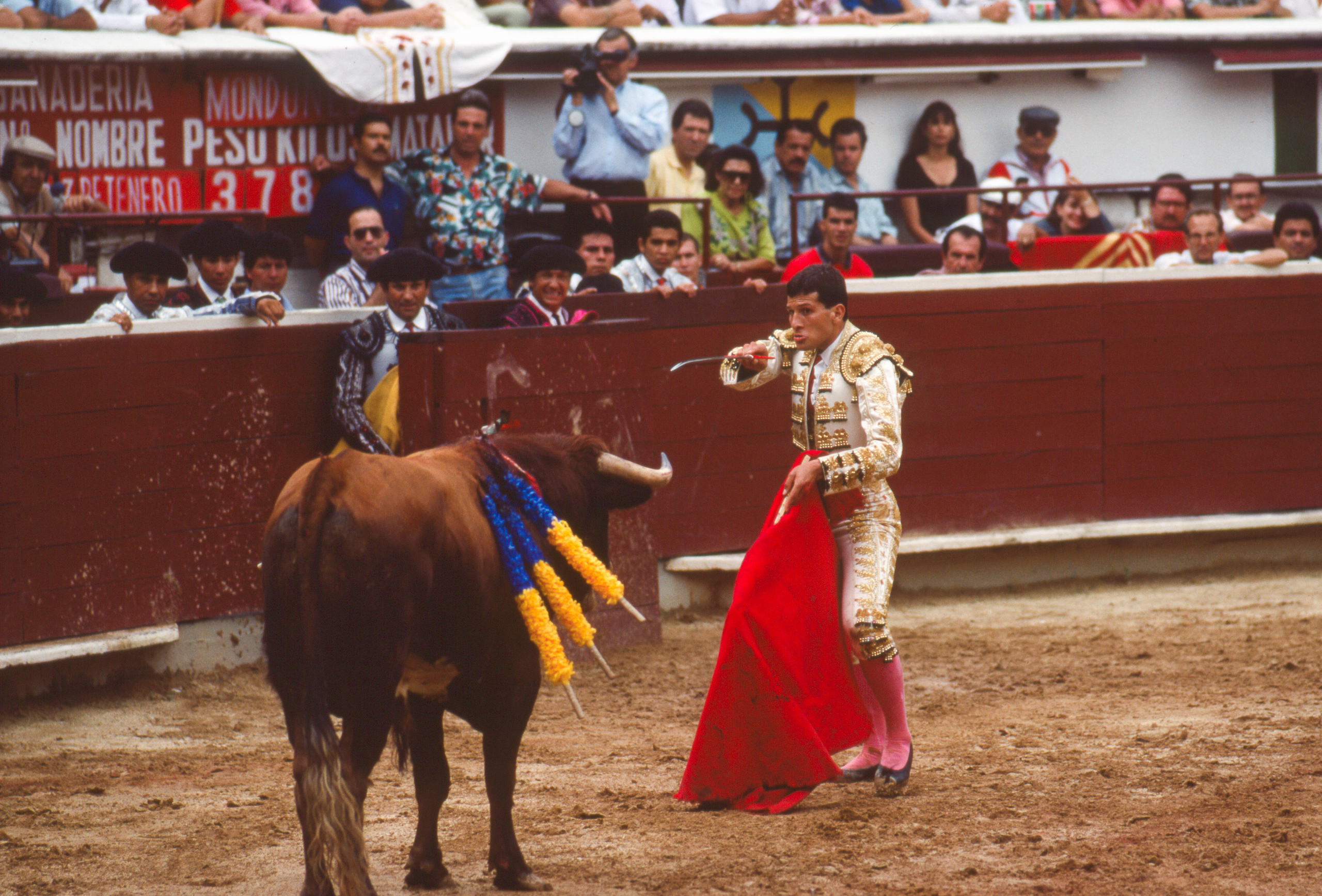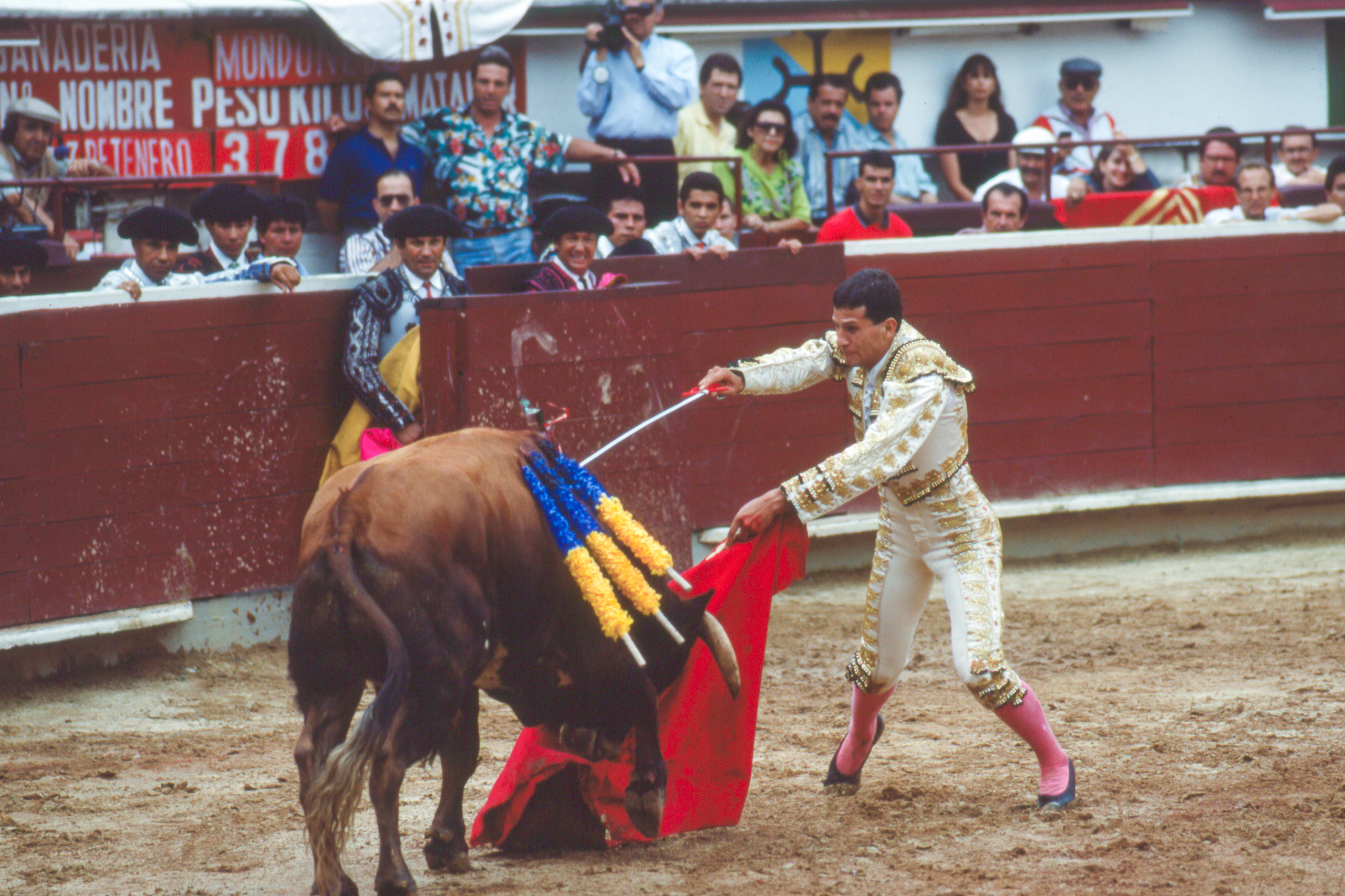 In November 1994, Padma and I followed my photographer mate, Victor Englebert, through the gates of Cali’s main bullring, the Plaza de Toros de Cañaveralejo. The concrete terraces were already filling, families and old men in hats leaning forward over the red timber barrier. Brass music drifted in the heat. Dust hung in the air.