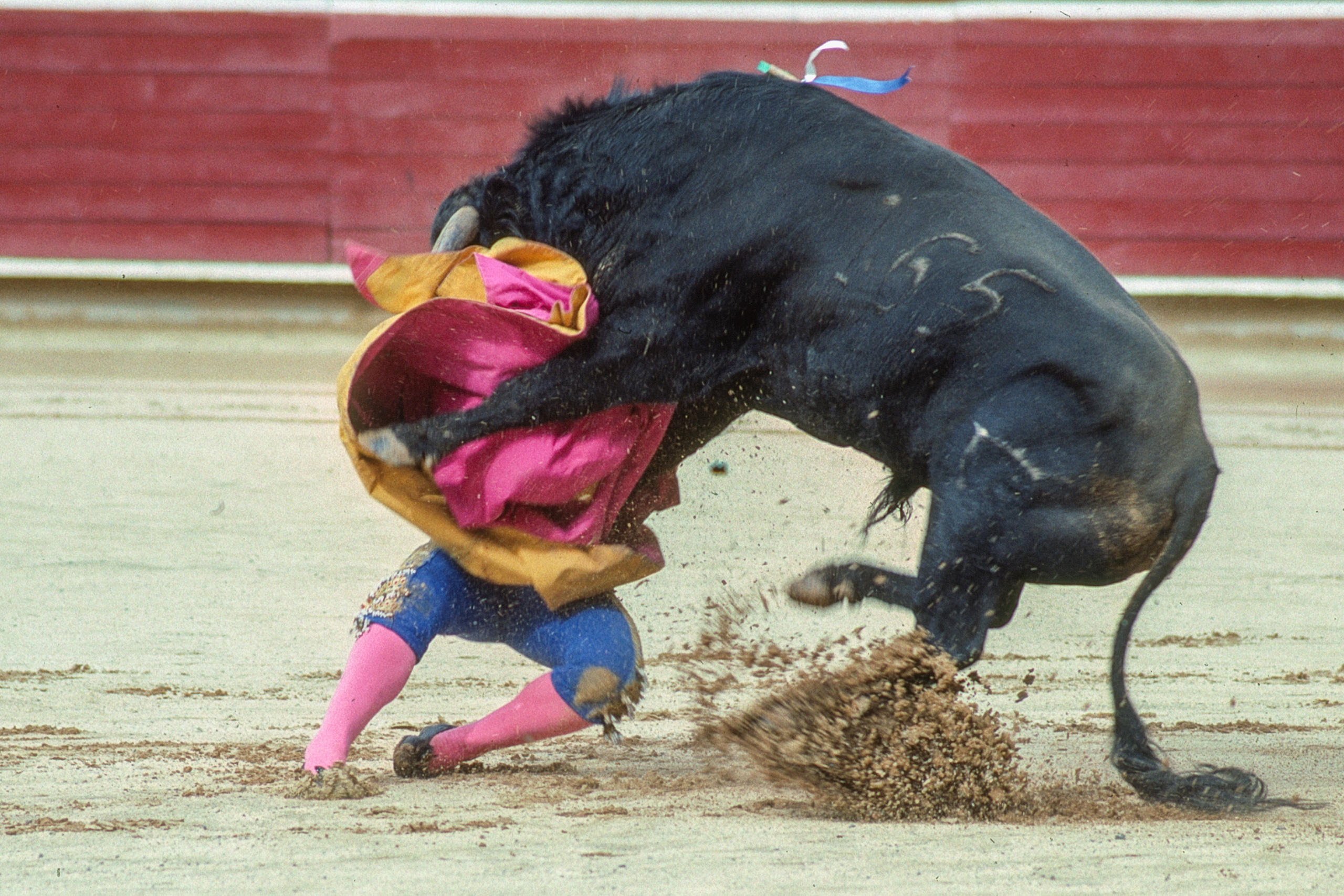 From my seat I photographed the banderillas driven into the bull’s shoulders – blue and yellow barbs protruding like cruel decorations. Blood darkened the hide. The animal’s breath shortened. In one frame I caught the bull lifting a man clear off the ground, dust exploding around them. In another, the bull lay folded beneath the barrier, attendants closing in with capes and blades.