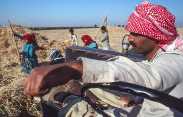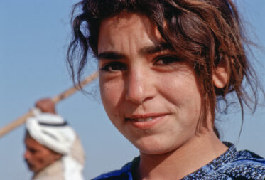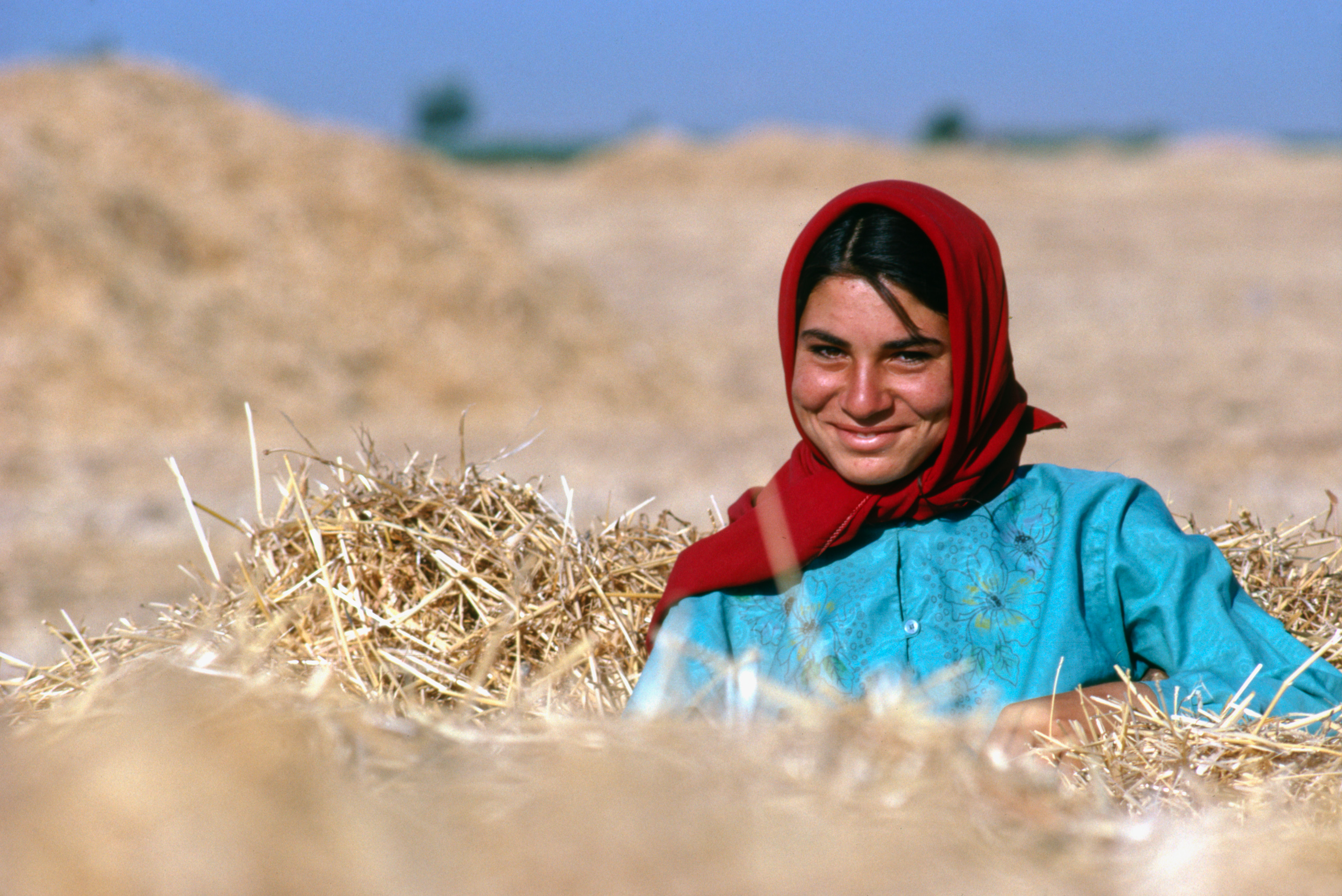 In 1990, I was shooting some photos of a group of men and women chopping up wheat straw for sheep fodder in northern Syria. I was trying to get around the mounds of straw when I heard a rustle in the next mound and this woman’s head popped up. I was sorry to have disturbed her during her hard-earned rest break but she was still rewarded me with a beautiful smile.