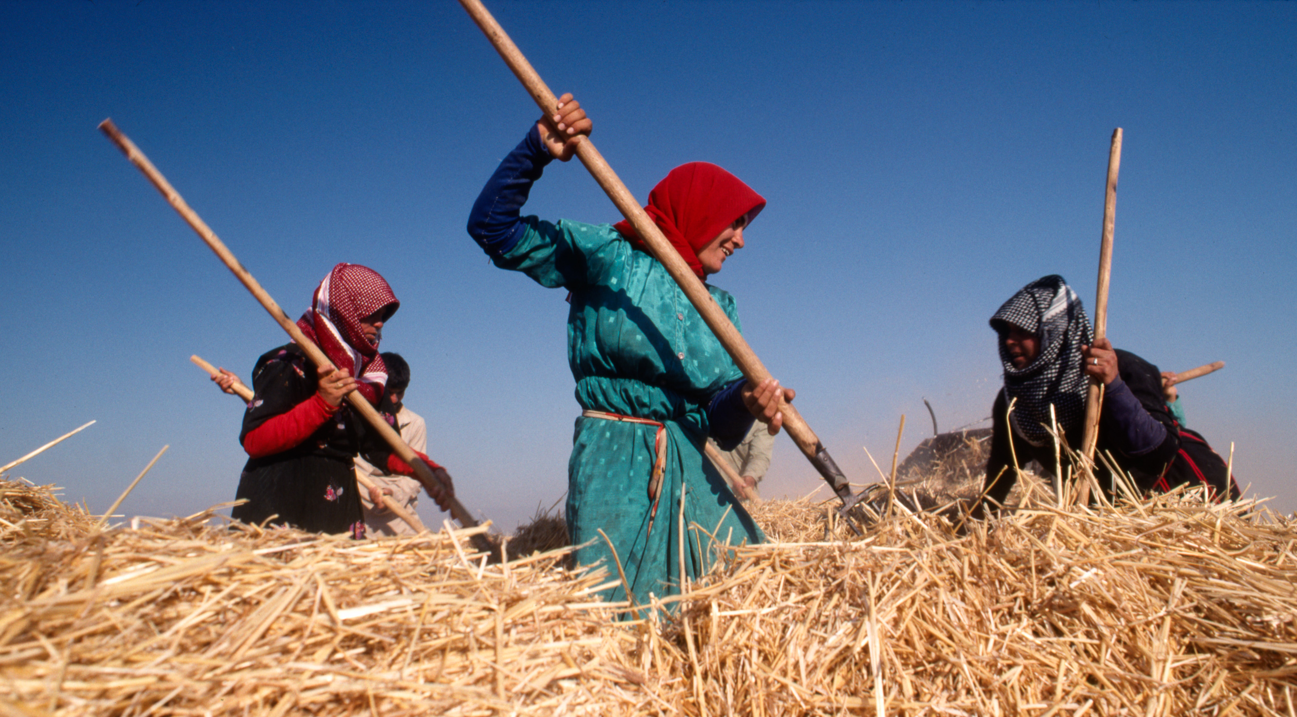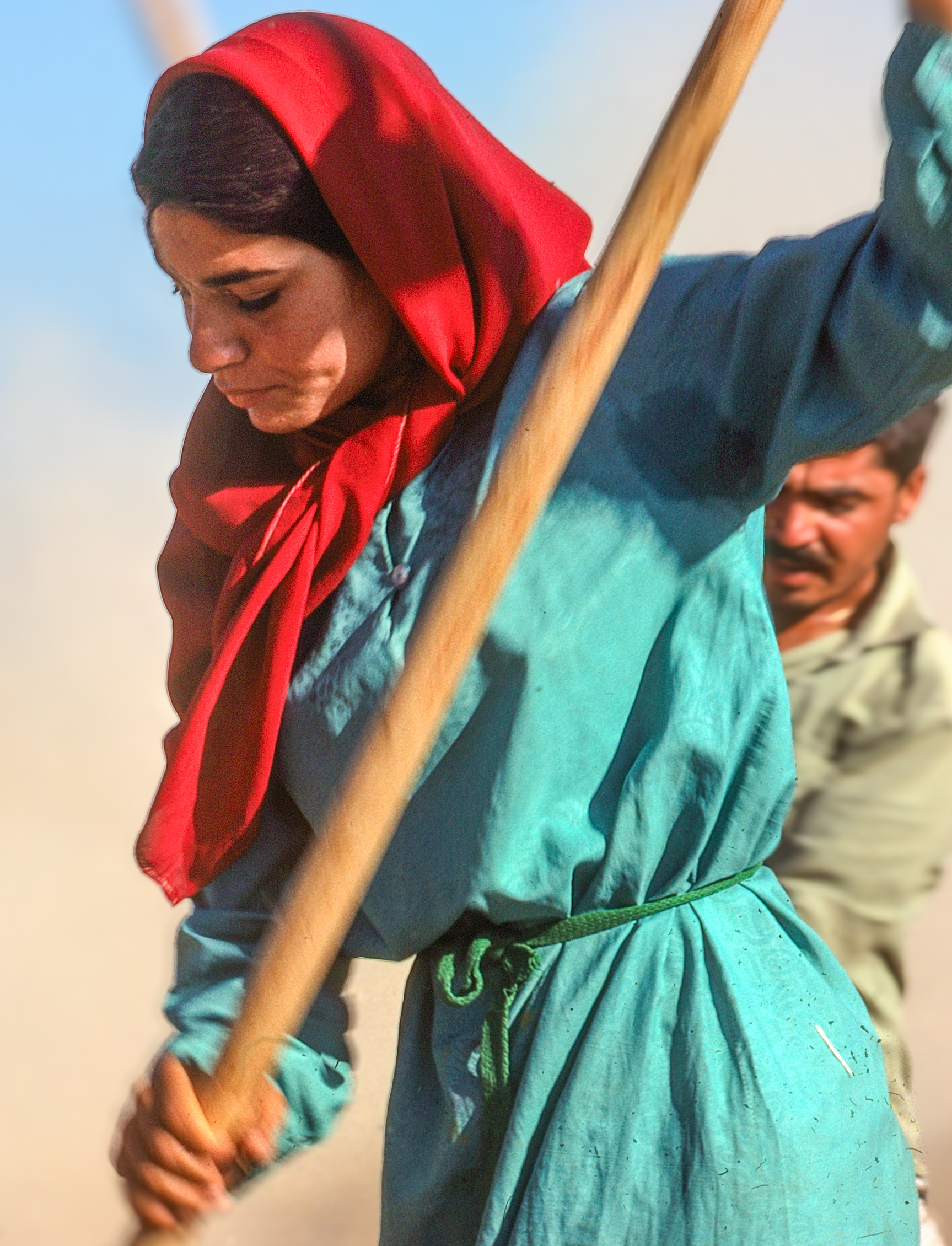 In 1990, I was shooting some photos of a group of men and women chopping up wheat straw for sheep fodder in northern Syria. I was trying to get around the mounds of straw when I heard a rustle in the next mound and this woman’s head popped up. I was sorry to have disturbed her during her hard-earned rest break but she was still rewarded me with a beautiful smile.