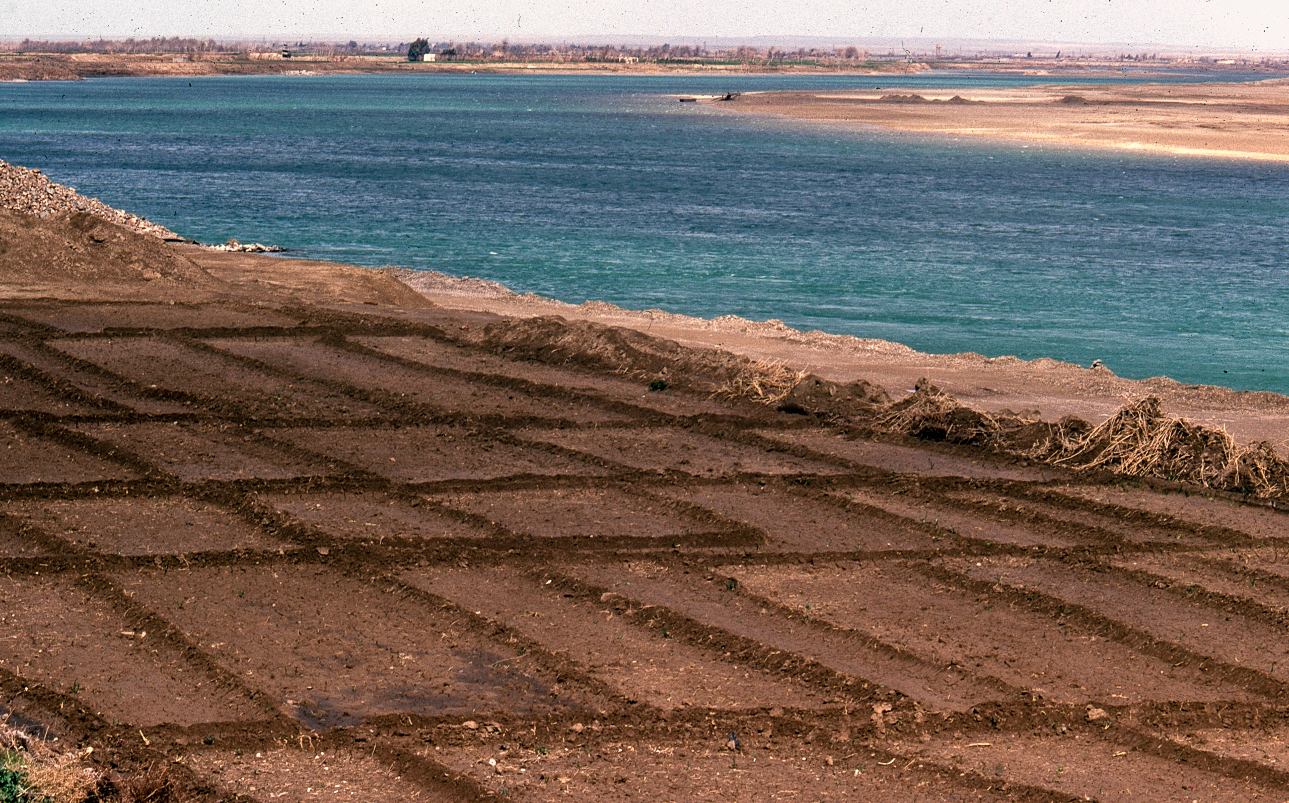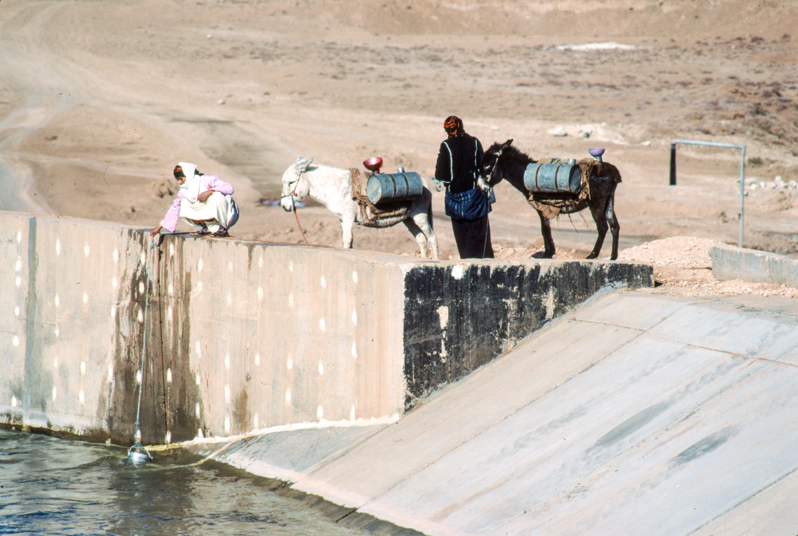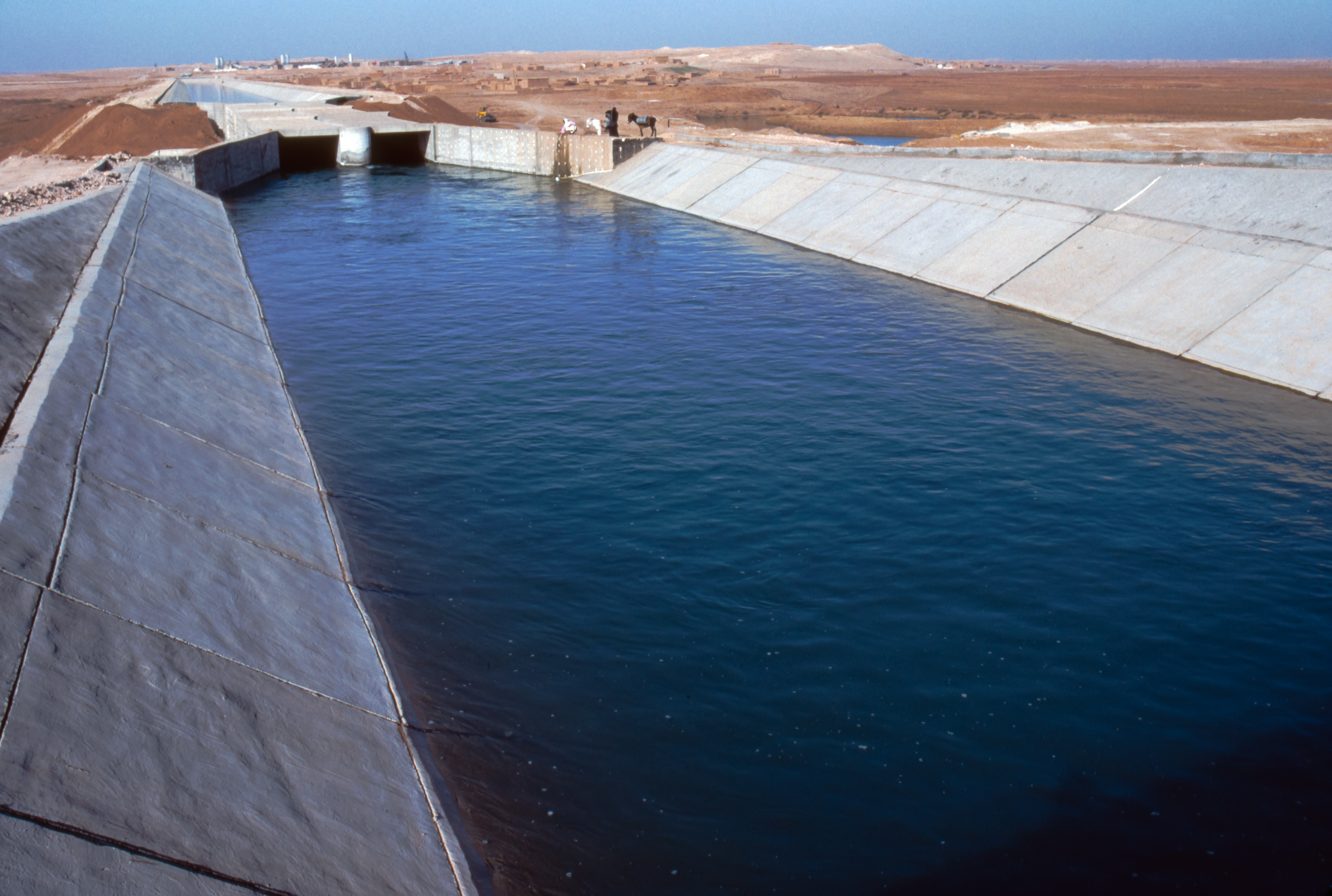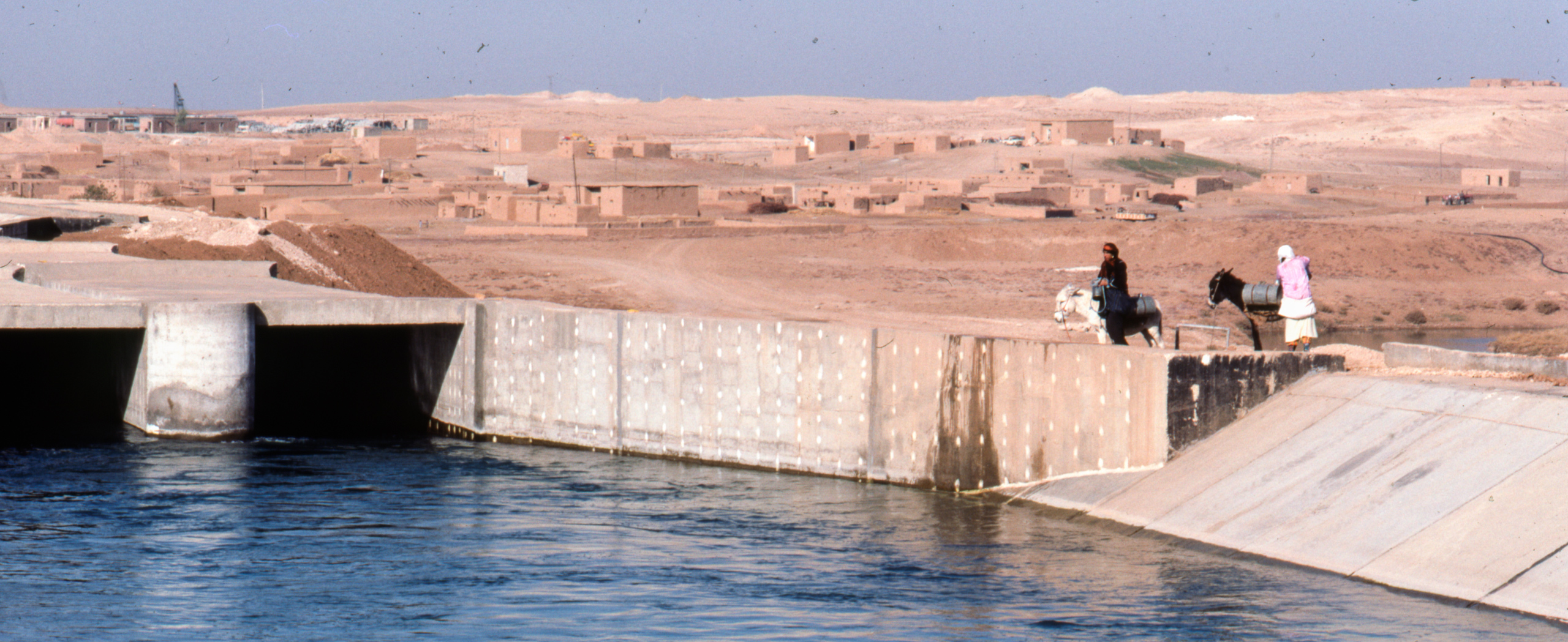 In 1974 Syria closed the Tabqa Dam on the Euphrates and hence began filling up the Lake Assad reservoir. The reservoir now provides drinking water to Aleppo via a pipeline and irrigation water via canals to agricultural areas. The Euphrates passes through the water-starved countries of Turkey, Syria and Iraq and the politics regarding the sharing of the water between the three countries can be complex.