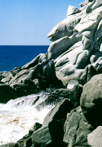 I wanted to escape for the day so I hiked up the coastline far away from the hustle and bustle of Cabo. I found an isolated spot on the rocks and wrote notes and postcards, played harmonica, sang songs, took photographs and listened to and watched the ocean. The power of the ocean as it struck the rocks below me was at times frightening. Behind me the wind had carved faces in the rock that gave me a sense of being watched.