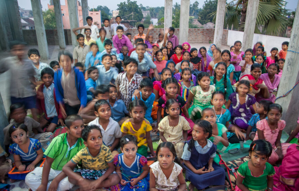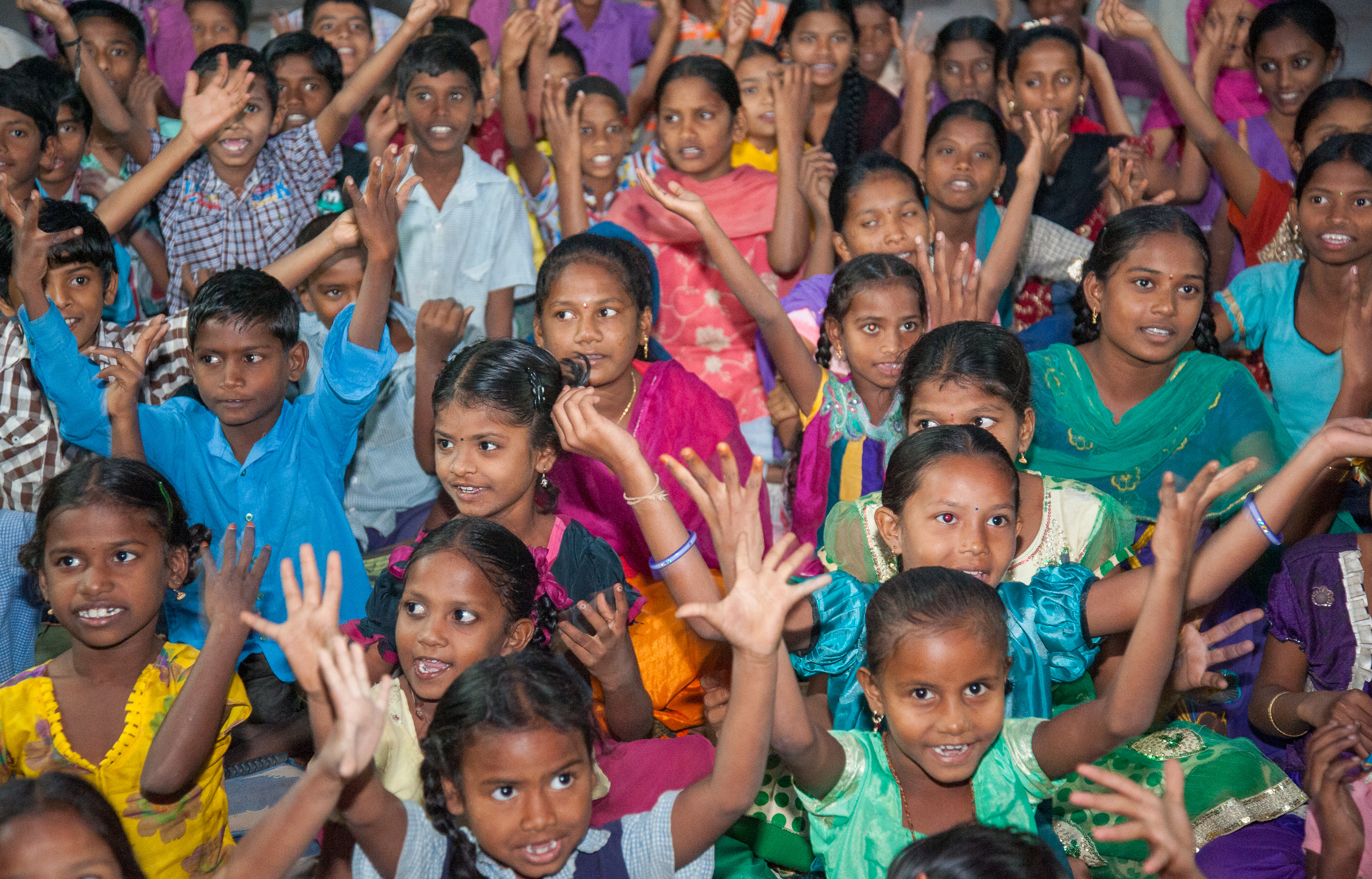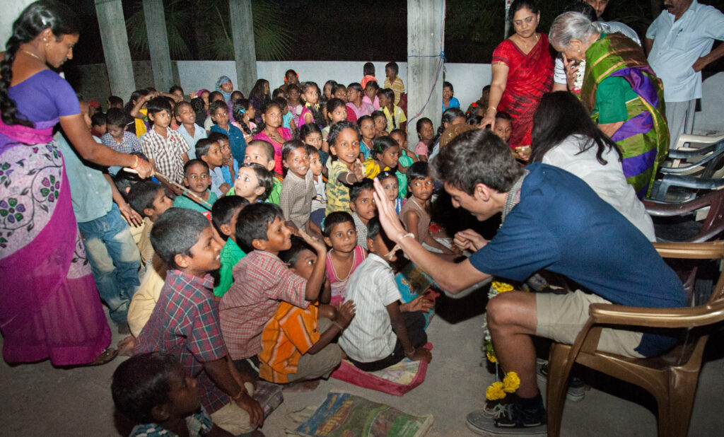As the top of my head started to appear above the stairway, I heard what sounded like a thousand unified screams. Children’s screams. As I emerged on the rooftop, I saw an assembly of children all sitting in neat rows and cheering my arrival. Surely they were mistaken as I’m not a rock star but at that moment I felt like one. I reached out to one of the boys in the front to shake his hand and then suddenly dozens of tiny little hands were extended toward me wanting to shake my hand. The screams continued as Mercy, Padma, Joe and Xander reached the top and reached a peak when Sampath appeared.