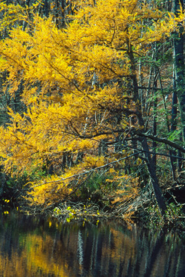 Once that barrier was crossed, I reached another stream. Yet this one had no dam; it led to a small kettle lake. I walked to the lake’s edge and found myself on a carpet of floating sphagnum moss. For a moment I stood spellbound by the artistry of the lake. Colors were splashed everywhere. The tamaracks splashed their golden colors, the sphagnum their amber and red, the pitcher plant their green and crimson and the cranberries their scarlet. Sunlight glistened off rain drops collected on the needles of the black spruces.