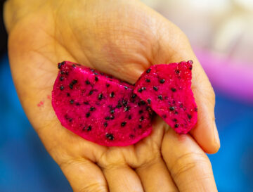 One of the joys of travel is to experience different foods … or foods that are excessively expensive in your own country. Dragon fruit is abundant now in Laos so I’ve been enjoying it while I can. It’s a cactus with origins in Mexico and Central America. But the French brought it to Southeast Asia where it is growing happily. Now it’s growing in popularity and available worldwide but perhaps at a premium price. Normally dragon fruit has white flesh but here in Laos we were offered a beautiful purple dragon fruit which was quite delectable.