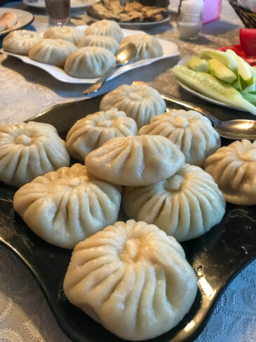 Kakha, Joe and I enjoy a feast at a guesthouse in a small village in the Caucasus near the Russian border.
